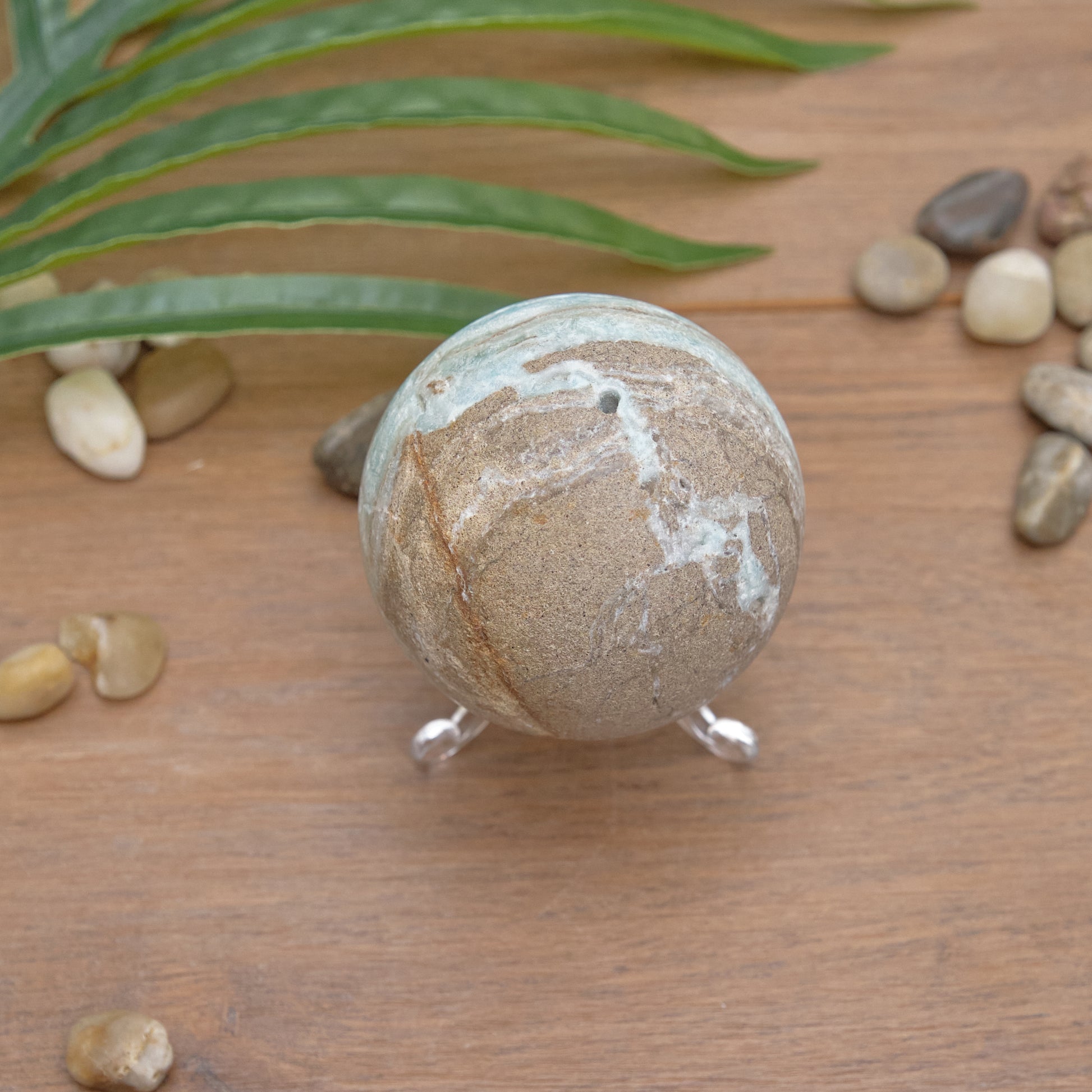 Embrace the serene energy of this natural Blue Aragonite sphere, originating from Pakistan, where some of the finest Blue Aragonite is found. Known for its soothing, sky-blue color with unique white and beige accents, this genuine crystal ball is perfect for collectors, spiritual practitioners, and anyone looking for an eye-catching decorative piece.