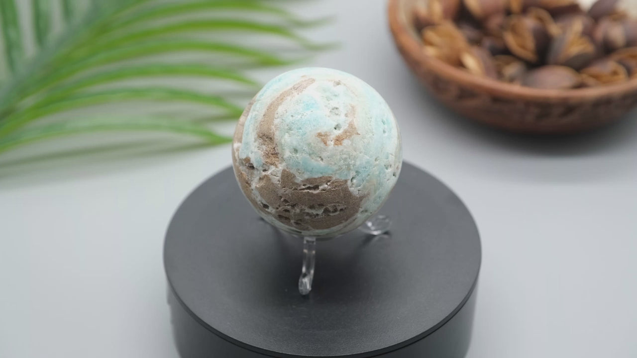 - Authentic Pakistani Blue Aragonite: Mined in Pakistan, this Blue Aragonite sphere showcases a soft blue hue with natural patterns and blemishes, making it an exquisite addition to any crystal collection.