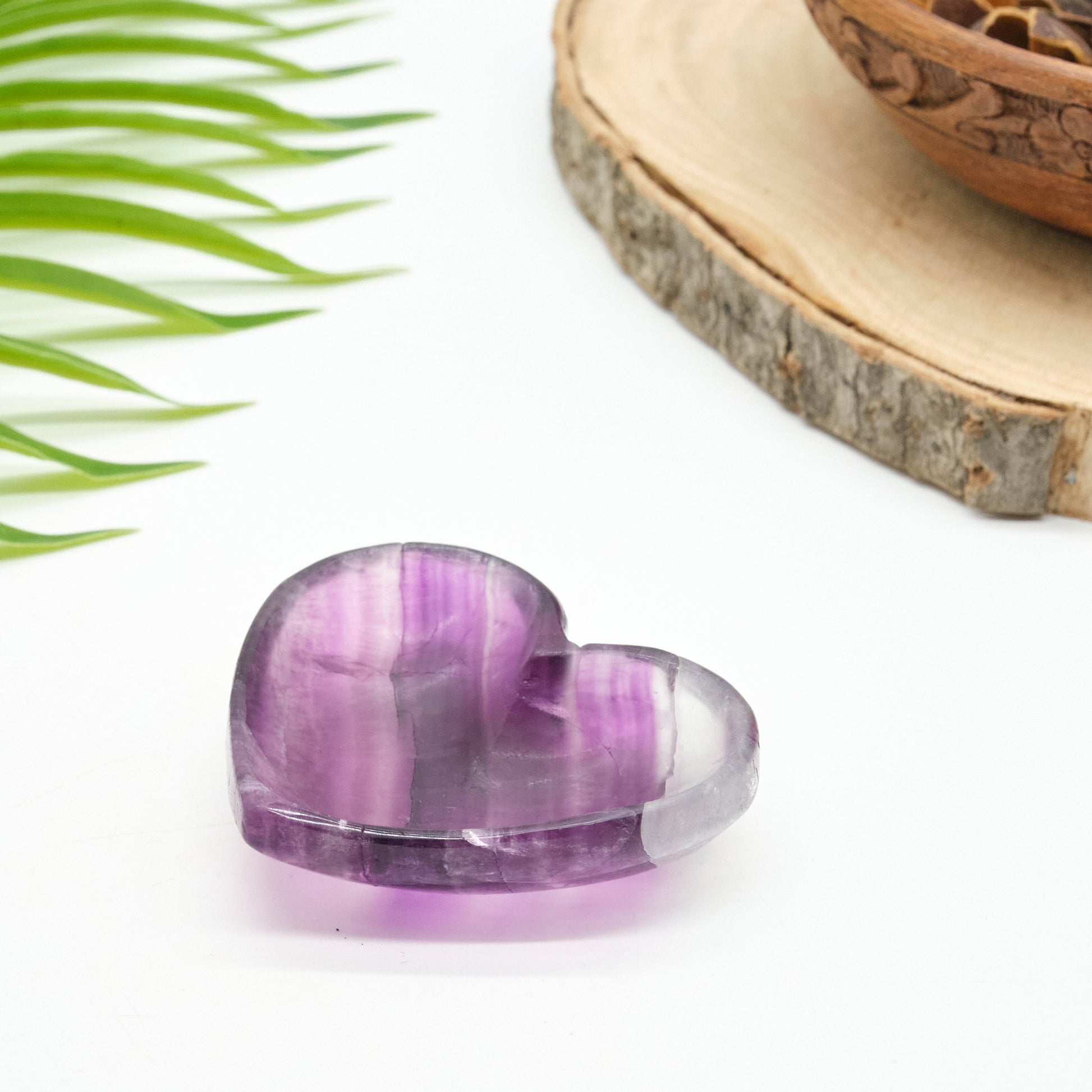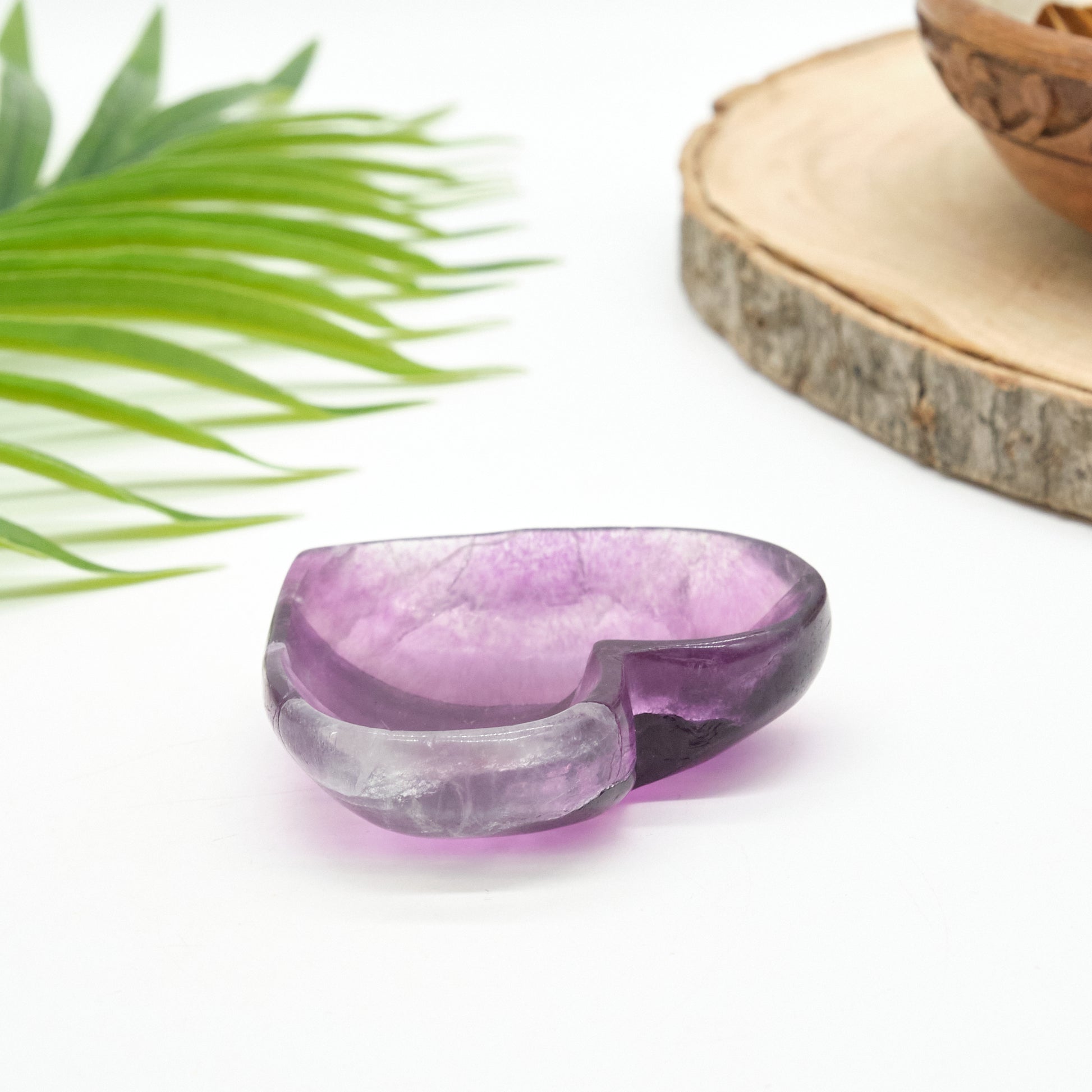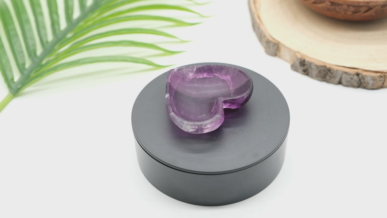 Enhance your space with this stunning Purple Fluorite Heart Bowl, showcasing stunning bands of rich purples with hints of white and subtle translucency. This hand-carved piece is as functional as it is beautiful!
