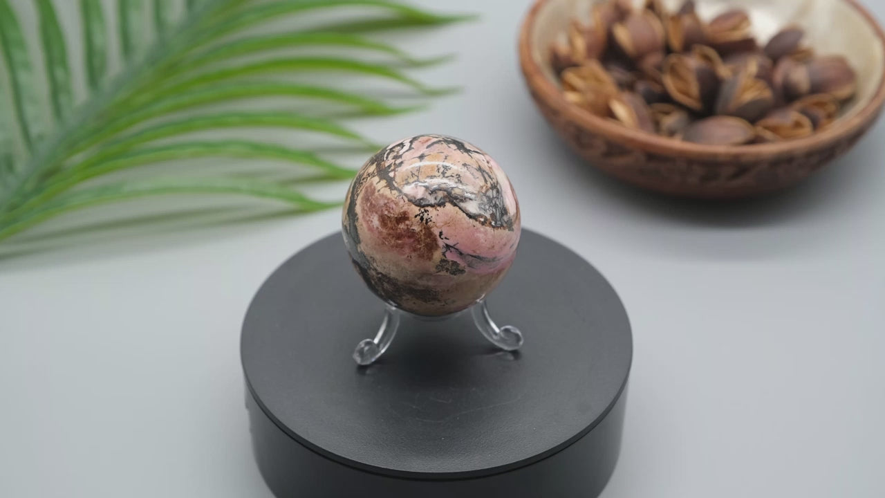 - Authentic Pakistani Rhodonite: Sourced from Pakistan, this Rhodonite sphere features striking shades of pink with natural black veining, making it both visually captivating and energetically powerful.