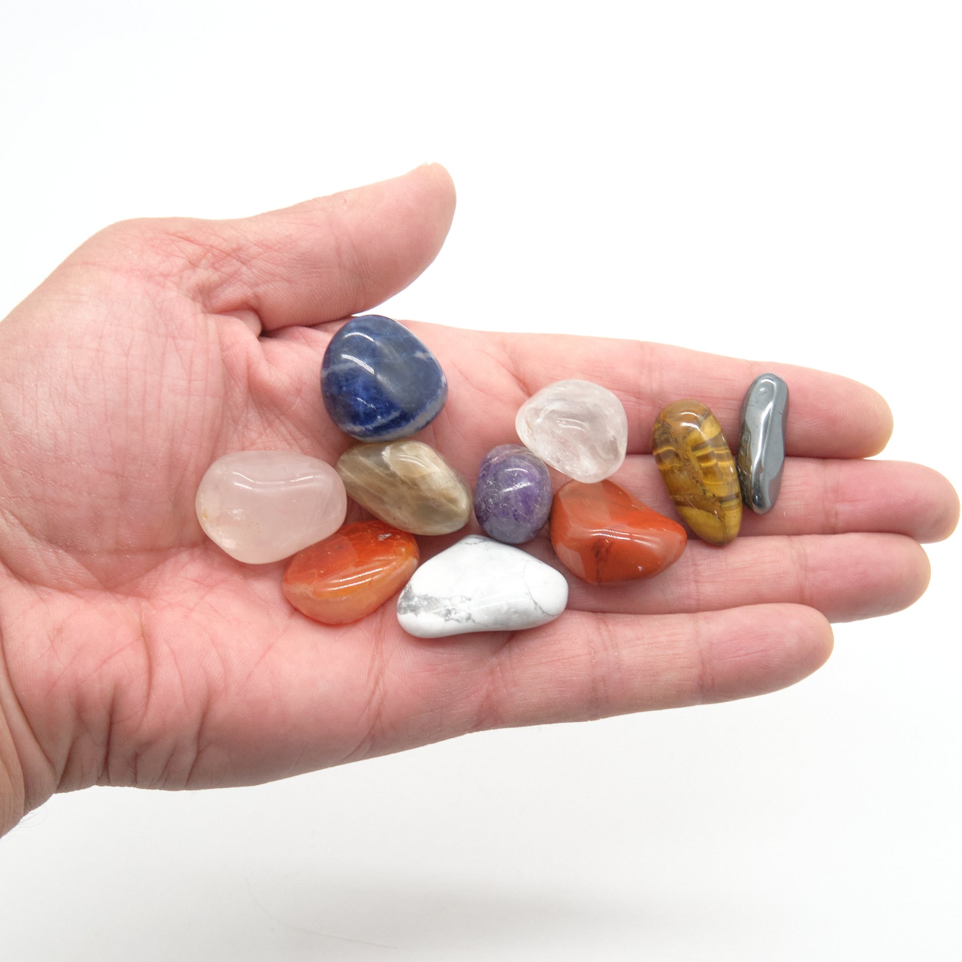 10 Polished Tumbled Stones: Rose Quartz, Amethyst, Gold Tiger’s Eye, Red Jasper, Carnelian, Sodalite, Moonstone, Hematite, White Howlite, and Clear Quartz