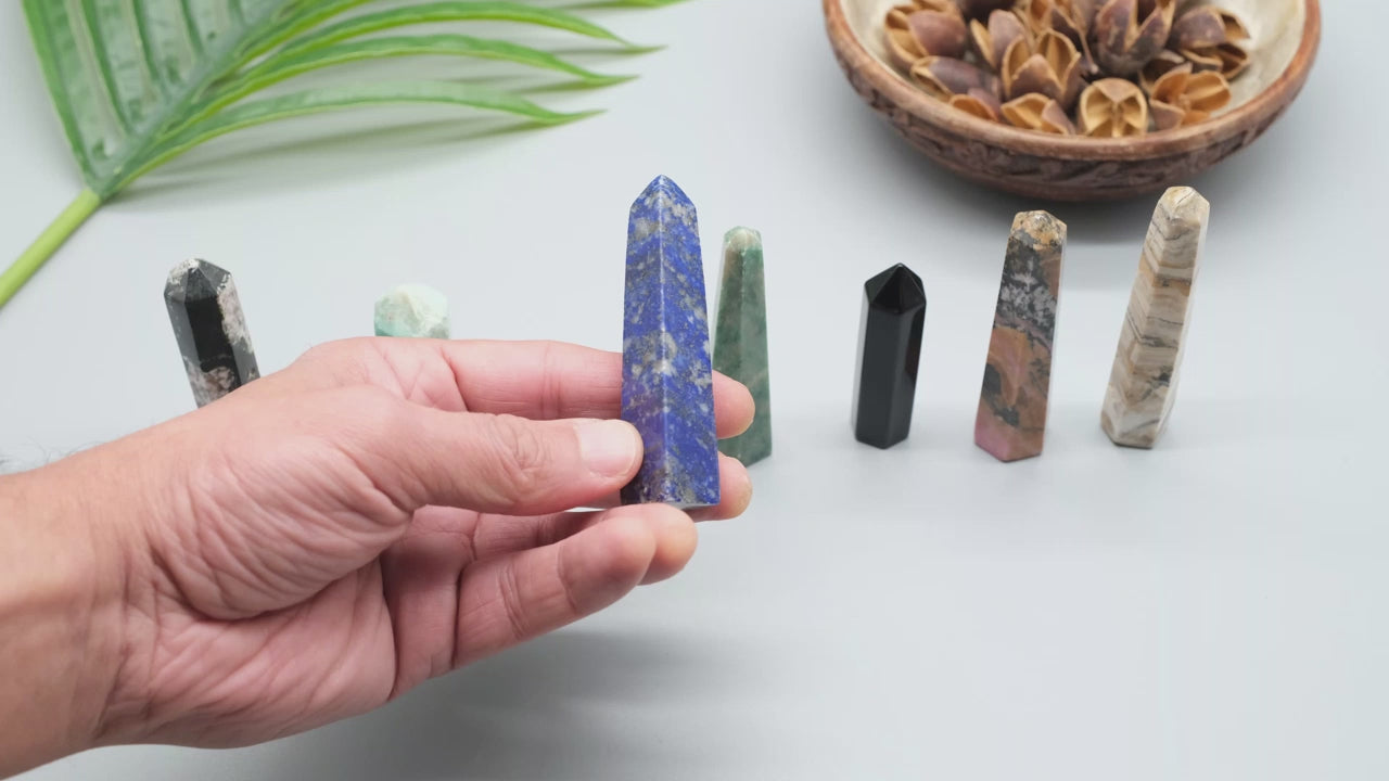 Enhance your space with these polished crystal Tower Points, various crystals available including Lapis Lazuli, Black Obsidian, and Rhodonite. Perfect for home decor, meditation, or as a thoughtful gift.